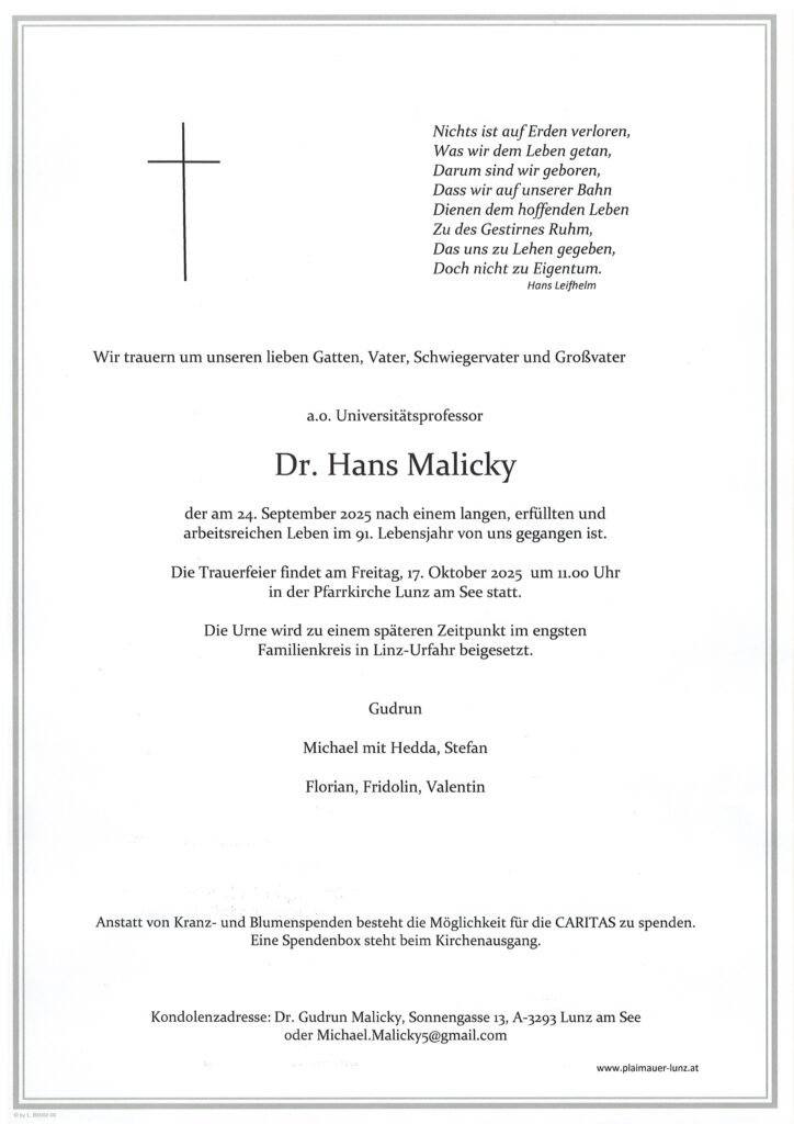 Dr. Hans Malicky 24.09.202525.09.202517 Kondolenzen zu Dr. Hans Malicky Friederike Resel 12.09.20251.10.2025 Walter Aflenzer 25.08.202510.10.2025 Karl Kern 25.07.202510.10.2025 Rudolf Schedl 23.07.202510.10.2025 Franz Bruckner 20.06.202510.10.2025 Maria Theuretzbacher 11.06.202510.10.2025 Stephan Helmel 30.05.202510.10.2025 Friedrich Lanzenberger 8.05.202510.10.2025 123