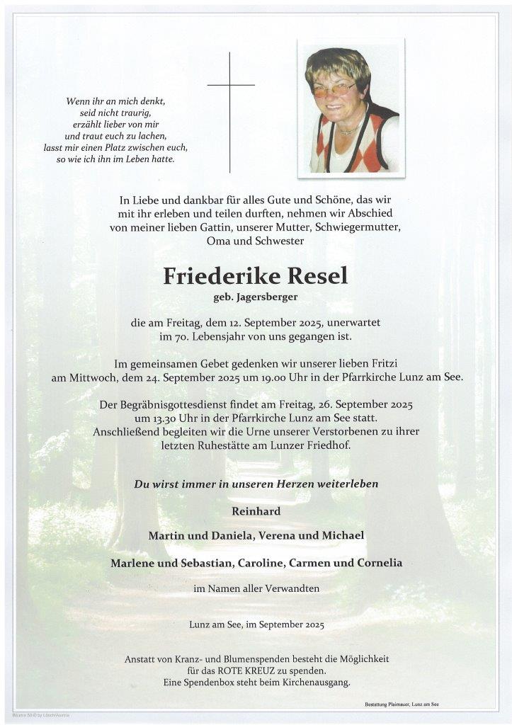 Friederike Resel 12.09.20251.10.2025 Walter Aflenzer 25.08.202510.10.2025 Karl Kern 25.07.202510.10.2025 Rudolf Schedl 23.07.202510.10.2025 Franz Bruckner 20.06.202510.10.2025 Maria Theuretzbacher 11.06.202510.10.2025 Stephan Helmel 30.05.202510.10.2025 Friedrich Lanzenberger 8.05.202510.10.2025 123