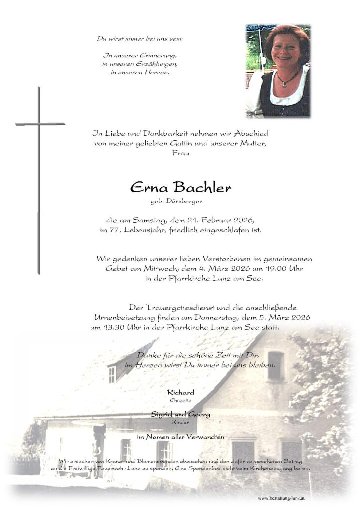 Erna Bachler 21.02.202622.02.202659 Kondolenzen zu Erna Bachler Erika Dinstl 24.01.202626.01.202676 Kondolenzen zu Erika Dinstl Frieda Bachner 24.01.20266.03.2026 Oskar Stadler 16.01.20266.03.2026 Friedrich Egger 7.01.20266.03.2026 Franz Heigl 31.12.202517.02.2026 Maria Osanger 29.12.202517.02.2026 Fritz Neuhauser 24.12.202517.02.2026 Walter Puritscher 1.12.202517.02.2026 Paula Leichtfried 11.11.202517.02.2026 123